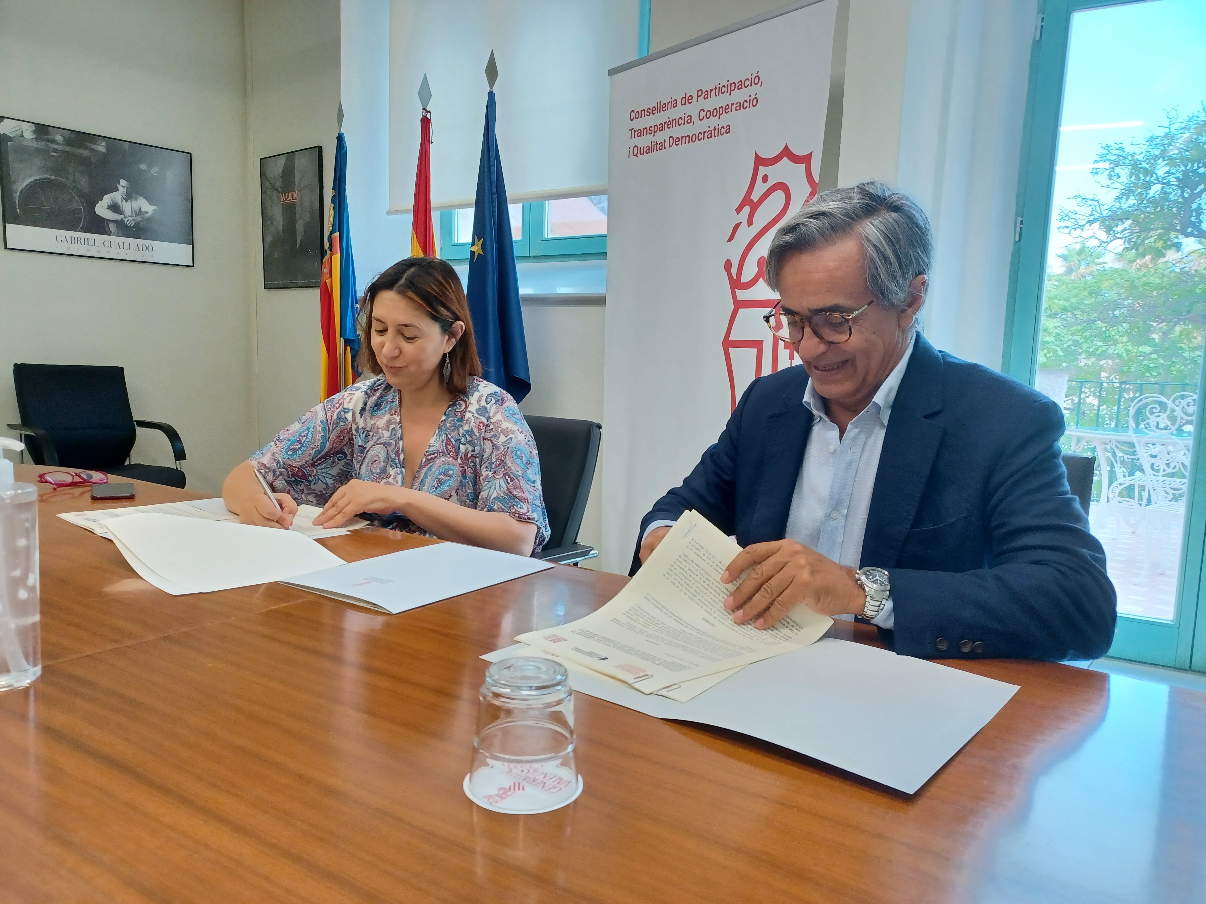 La consellera de Participación, Transparencia, Cooperación y Calidad Democrática, Rosa Pérez Garijo, y el secretario general de Transparencia lnternacional España (TI-E), Jesús Sánchez Lambás, han firmado un convenio marco de colaboración para promover la transparencia, la rendición de cuentas y la integridad pública.