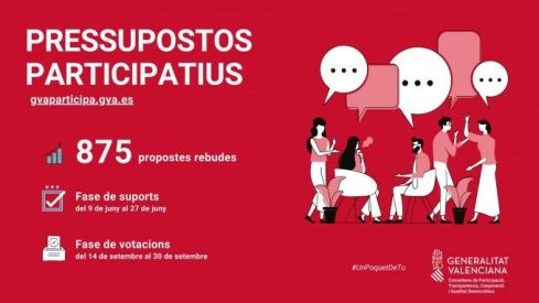 La Conselleria de Participación, Transparencia, Cooperación y Calidad Democrática ha recibido 875 propuestas a los primeros presupuestos participativos de la Generalitat para 2022 desde que se abrieron a la ciudadanía el pasado 11 de mayo y tras finalizar el plazo de presentación el 30 de mayo.La consellera de Participación, Rosa Pérez Garijo, se ha mostrado muy satisfecha tras finalizar la primera fase de presentación de propuestas "donde la ciudadanía ha mostrado un gran interés en poder trasladar sus iniciativas para formar parte de estos primeros Presupuestos Participativos".Pérez Garijo ha afirmado que el volumen de participación "demuestra que estamos en el camino correcto", a lo que ha añadido que "esperamos que vaya incrementándose la contribución de los ciudadanos y ciudadanas en las siguientes fases de un proyecto que muestra la voluntad del Gobierno del Botànic por la participación ciudadana, que quedará plasmada en los Presupuestos de la Generalitat para 2022".Los primeros Presupuestos Participativos de la Generalitat para el ejercicio 2022 cuentan con 125 millones de euros que se distribuyen atendiendo a criterios de población, pobreza y despoblación. En este sentido, 87,5 millones de euros, lo que supone el 70% de los recursos totales, se distribuyen en áreas comarcales de la Comunitat, mientras que los 37,5 millones restantes, que representan el 30%, se dirigen a proyectos de ámbito autonómico.