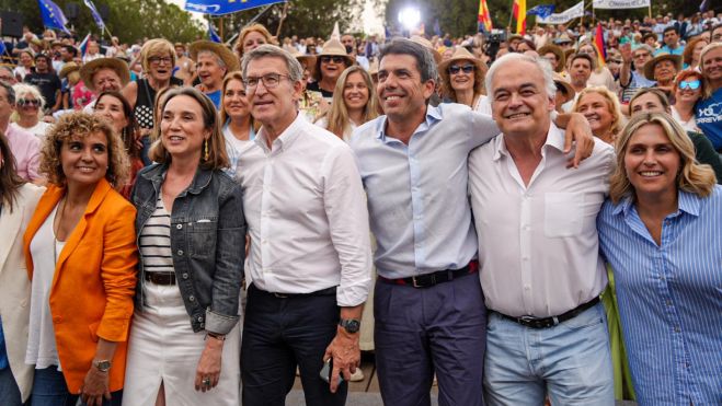 El presidente valenciano ha participado en el mitin de cierre de campaña con Alberto Núñez Feijóo y Dolors Montserrat junto a la alcaldesa, María José Catalá; el presidente del PP de la provincia de Valencia, Vicent Mompó; y el candidato al Parlamento Europeo y vicesecretario de Institucional, Esteban González Pons.