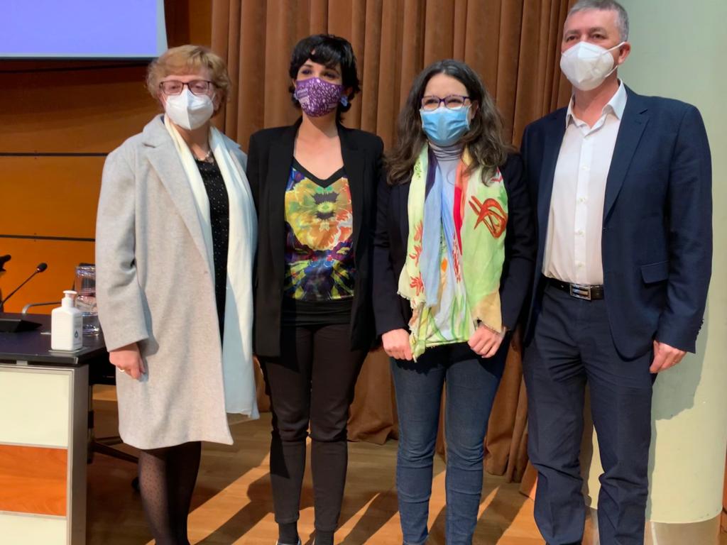La vicepresidenta ha estado acompañada por la secretaria de Estado de igualdad y Contra la Violencia de Género, Ángela Rodríguez; la directora del Instituto de las Mujeres, Beatriz Gimeno; y el conseller de Economía, Sectores Productivos, Comercio y Trabajo, Rafa Climent.