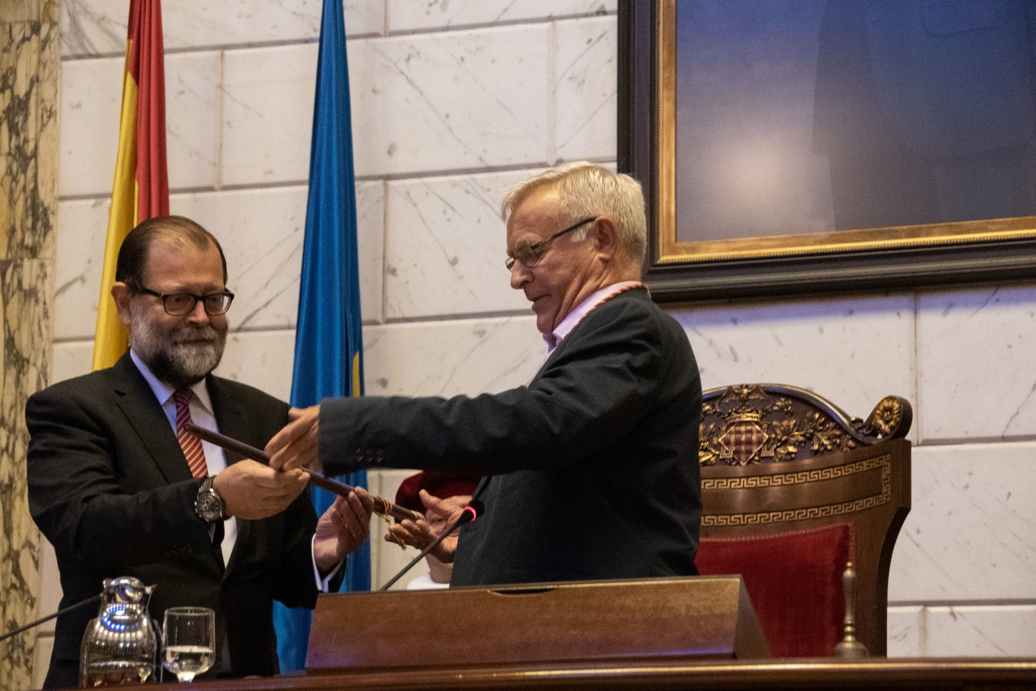 Entre aplausos y sonrisas del PSPV y Compromís, Ribó se ha dispuesto a jurar el cargo para después pasar por el trámite de la 'Vara de Mando': "Pedro, constato que la has conservado muy bien estos cuatro años, y como lo has hecho tan bien, te la devuelvo", ha bromeado apenas unos segundos después de sostenerla.