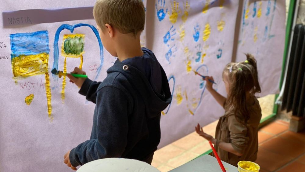 Dos alumnos pintan con los colores de la bandera de Ucrania en un colegio
