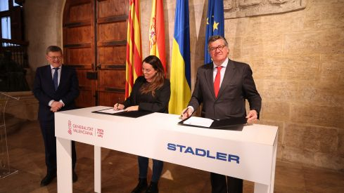 Durante su intervención tras el acto de firma entre la directora gerente de Ferrocarrils de la Generalitat, Anaïs Menguzzato, y el presidente de Stadler, Íñigo Parra, el president ha mostrado su apoyo a esta empresa radicada en Albuixec y ha destacado que el acuerdo alcanzado también contribuye a la reindustrialización de la Comunitat Valenciana “basada en la innovación, la movilidad y el empleo de calidad”.