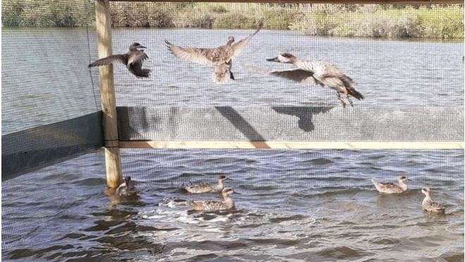 El pasado 8 de abril fueron introducidas en la estructura de aclimatación un total de 20 cercetas pardilla, 10 machos y 10 hembras procedentes de las nacidas en cautividad en el Centro Recuperación de Fauna la Granja del Saler dependiente de la Dirección General de Medio natural y de Evaluación Ambiental de la citada Conselleria. Todas ellas llevan anillas de reconocimiento a distancia, de color naranja y código individual, para facilitar su seguimiento posterior. Se los ha proporcionado alimento cada dos días hasta el miércoles 13 de abril, momentos antes de proceder a la apertura de la estructura porque las cercetas puedan desplazarse con autonomía y empezar a buscar alimento por sí mismas.