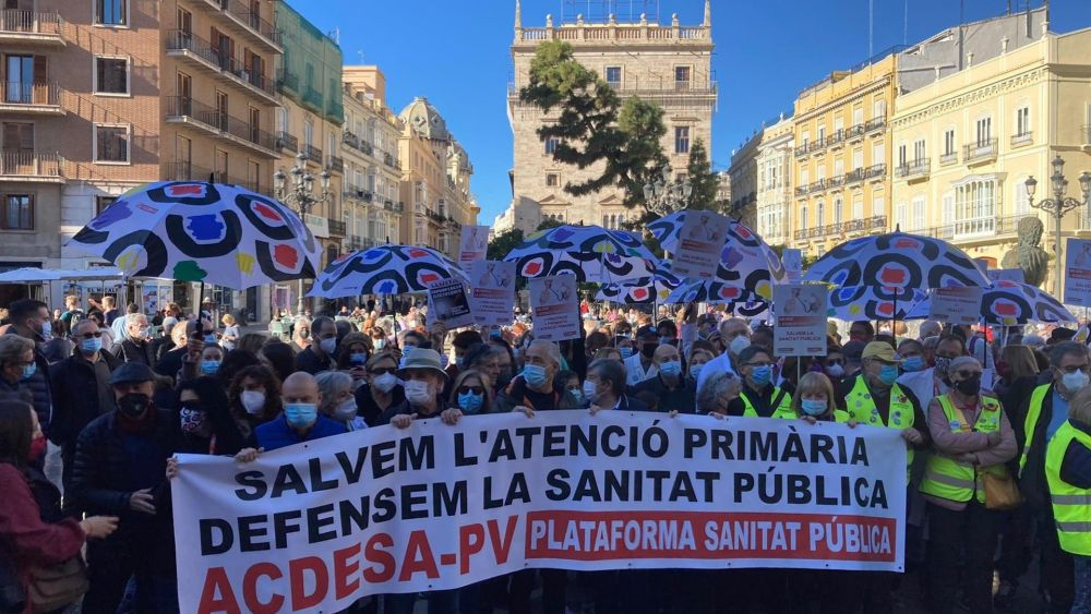 La protesta, bajo el lema 'Salvemos la Atención Primaria', ha sido organizada por la Plataforma en Defensa de la Sanidad Pública (ACDESA), CCOO, entre otras. Ha comenzado a las 12 horas en la Plaza de la Virgen y los participantes han portado carteles con mensajes como 'Sin primaria no hay futuro' o 'Salvem l'Atenció Primaria. Salvem la Sanitat Pública', al tiempo que coreaban 'Una sanidad pública de calidad'.