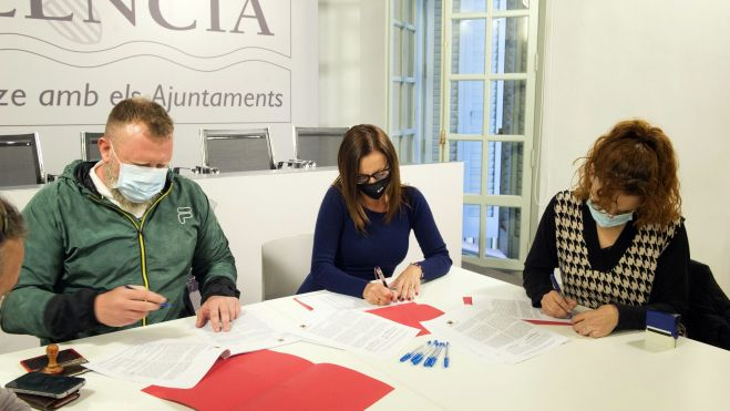 La presidenta del Consorcio Provincial de Bomberos de València, Maria Josep Amigó, ha firmado el acuerdo con los sindicatos mayoritarios (UGT y STAS, que representan el 77% de la parte social del CPBV) acerca de las condiciones de trabajo de todos los empleados públicos al servicio del Consorcio. El acto de la firma ha tenido lugar este martes al Palacio de la Batlia, sede de la Diputació de València.