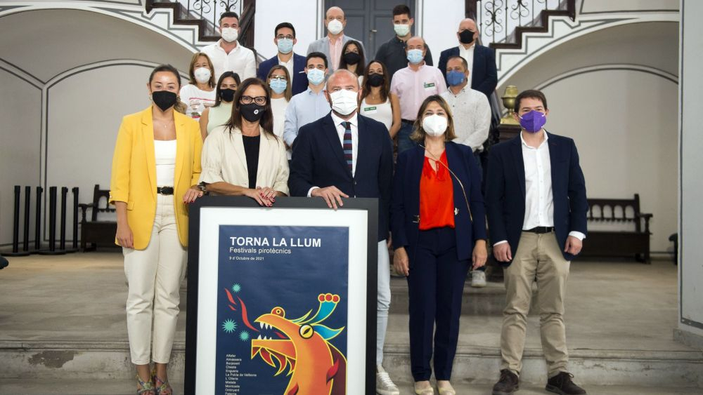 Acompañados por la vicepresidenta Mª Josep Amigó, la diputada Rocío Gil y el diputado Joan Sanchis, pirotécnicos y responsables locales de los municipios que participan en la segunda edición del evento, el presidente de la Diputació, Toni Gaspar, y la presidenta de Piroval, Mª José Lora, han presentado los detalles del regreso de ‘Torna la Llum’, con los municipios seleccionados por la organización y el cartel del evento, obra del artista de Llombai Martín Forés, quien combina el cartelismo con las artes plásticas y decorativas. La propuesta de Forés es un gran dragón de vivos colores, símbolo del renacimiento, de cuya boca brotan los fuegos artificiales que iluminarán la velada del 9 d’Octubre en distintas comarcas valencianas.