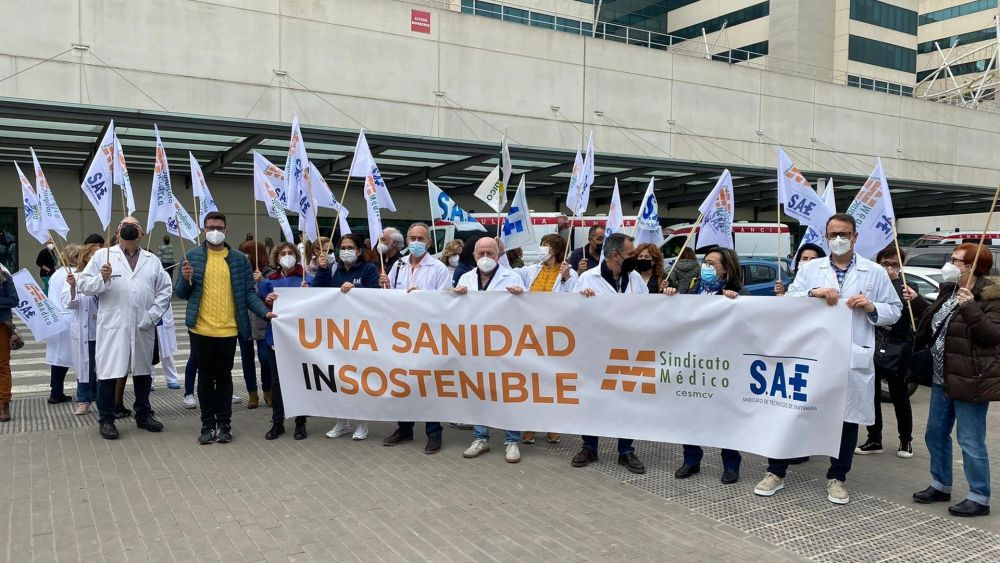 El Sindicato Médico CESMCV ha celebrado este lunes una concentración frente al buque insignia de la sanidad valenciana para reivindicar que "todos los contratos médicos son necesarios" y contra la precariedad laboral con una pancarta en la que se podía leer: 'Una sanidad insostenible'.
