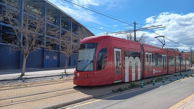 Un tranvía de Metrovalencia durante su paso por el Estadi Ciutat de València