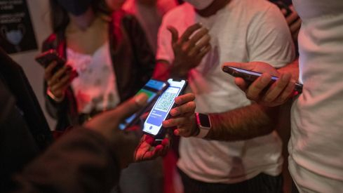 Una persona muestra un código QR para entrar a un local de ocio nocturno