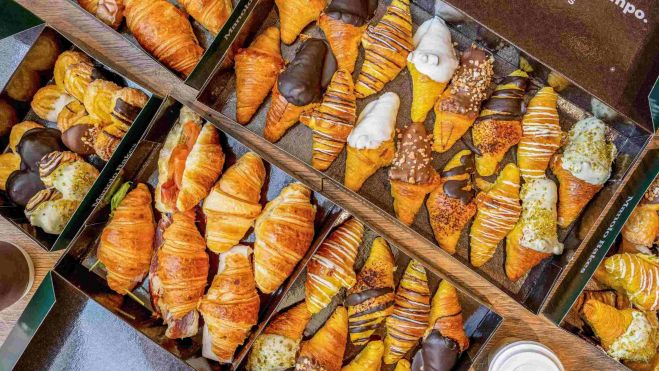 La carta de Manolitos es extensa y además de pequeños croissants tienen cafés, bollería variada o palmeritas. Se divide en dos partes la dulce (con el crocanti, el original, el de galleta Lotus o el de pistacho) y la salada (con el de paleta ibérica y tomate, pastrami o salmón y eneldo).