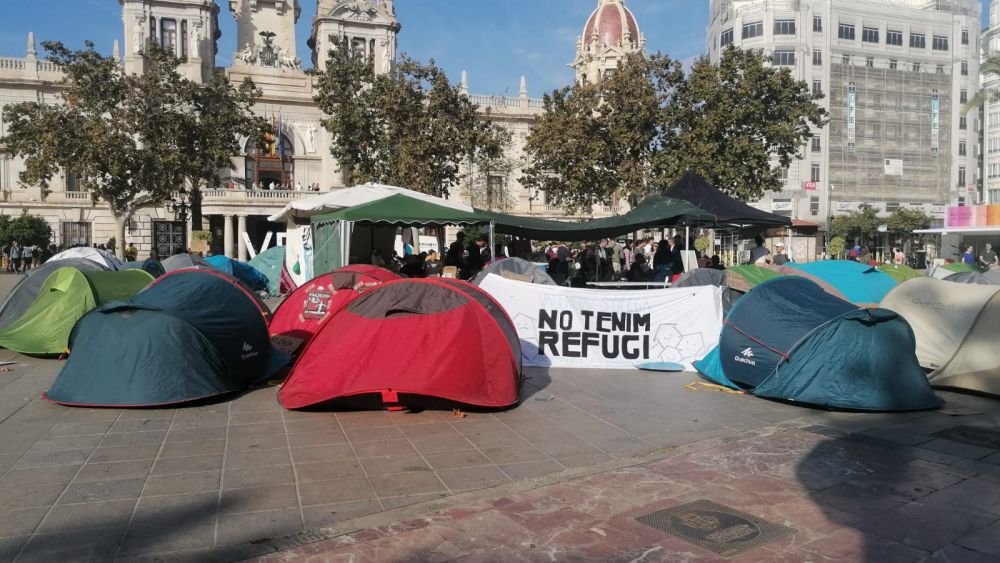 "Si no tenemos casa, ocupamos la plaza". Este es uno de los lemas que más se escucharon en la manifestación que tuvo lugar el pasado sábado en València por el problema de la vivienda y el alquiler. Y del dicho al hecho, unas 50 personas aproximadamente acamparon esa misma noche en la Plaza del Ayuntamiento de la ciudad. En total, este martes se han cumplido ya tres noches desde que las tiendas de campaña se situaron en la calle, que han ido creciendo en número y ocupación a lo largo de los últimos días.
