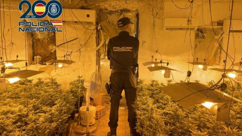 Un agente de la Policía Nacional junto a las plantas de marihuana en una de las viviendas de Alzira