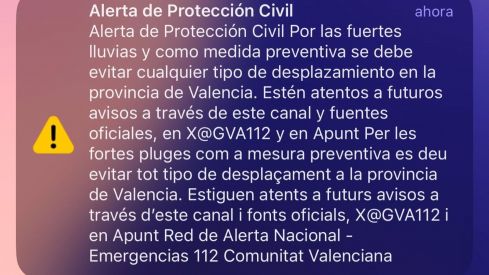 El sistema de alertas masivas y directas a la población 'ES-Alert' ante emergencias y catástrofes ha llegado este martes por la tarde, sobre las 20.10 horas, a la ciudadanía de Valencia para informar de manera preventiva a los habitantes de toda la provincia.