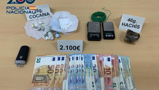 Como resultado de la operación, han sido intervenidos alrededor de 20 gramos de cocaína, diez papelinas de dicha droga dispuestas para la venta con un peso de ocho gramos y 46 gramos de hachís, así como dos básculas digitales de precisión, 2.100 euros, un turismo, recortes de bolsas de plástico y un rollo de alambre, según precisa la Policía Nacional en un comunicado.