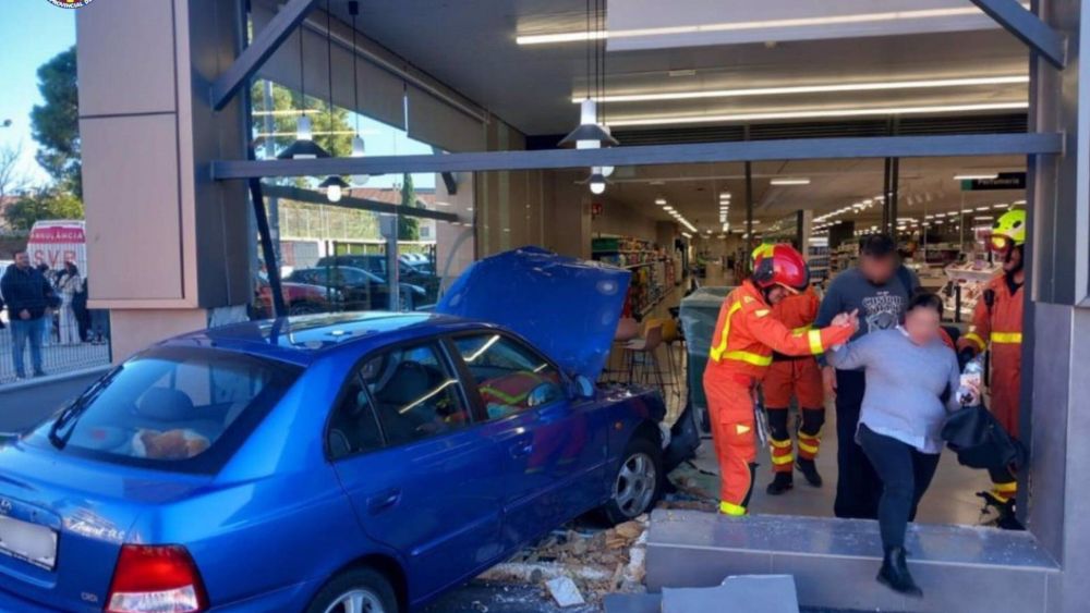 Dos personas han resultado heridas y trasladadas al hospital después de que un coche chocara y quedara empotrado en la fachada de cristal de un supermercado de Burjassot, según han informado el Consorcio Provincial de Bomberos y el Centro de Información y Coordinación de Urgencias (CICU).