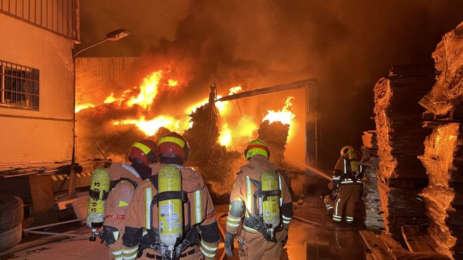Un incendio afecta una fábrica de madera de Quart de Poblet desde esta madrugada. El Consorcio de Bomberos de València trabaja desde primera hora de la noche en tratar de sofocar el fuego que devora una empresa dedicada a la madera, ubicada en el cruce entre C/ de la Pinadeta y C/ Júcar-Turia.