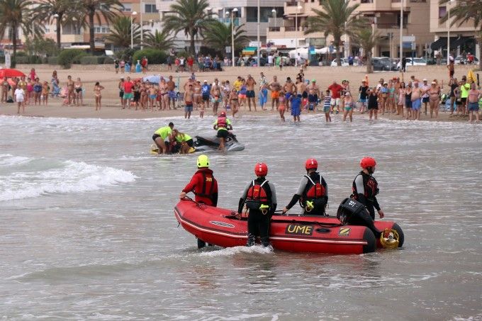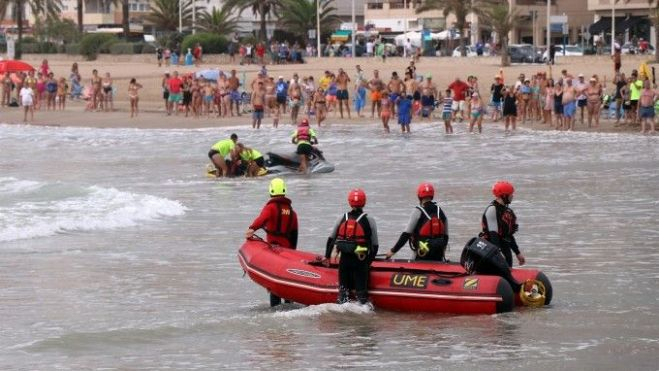 Mientras tanto, el servicio de salvamento y socorrismo ha intervenido en el agua para desalojar la zona y atender a las personas, mientras que la Policía Local, Policía Nacional y Protección Civil lo ha hecho fuera del agua estableciendo un perímetro de seguridad.