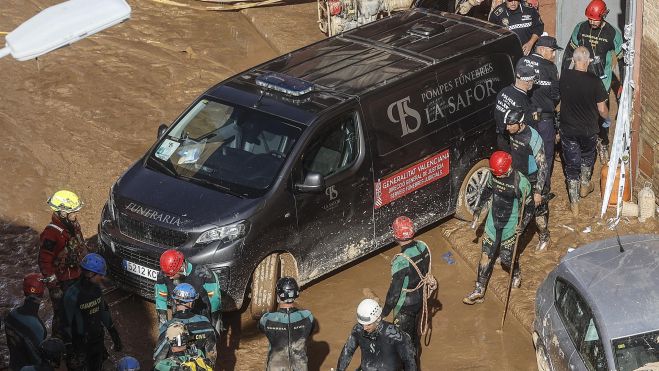 Un furgón de la funeraria sale de un garaje con cadáveres localizados tras el paso de la DANA, en el barrio de la Torre, a 31 de octubre de 2024, en València, Comunidad Valenciana (España). - Rober Solsona - Europa Press