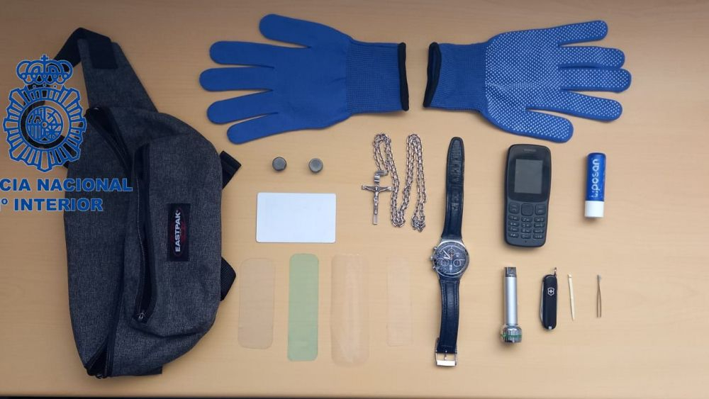 Mientras llegaba la patrulla, el agente inspeccionó la riñonera que portaba el sospechoso, localizando unos guantes, una linterna, una navaja multiusos, una barra de labios, cuatro testigos de plástico (como el que encontró en la puerta), dos imanes cilíndricos, unas pinzas, un reloj, una cadena plateada y un teléfono móvil.