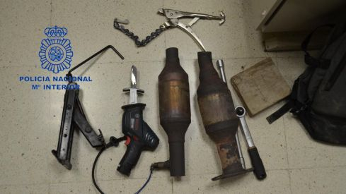 Paralelamente, otro indicativo policial que se encontraba por la zona, localizó un vehículo ligeramente elevado mediante un dispositivo de presión neumática, así como varias herramientas a su alrededor. Tras dar varias batidas por la zona, los policías observaron en el interior de un parking a dos personas agazapadas junto a un vehículo. Los policías registraron el coche e interceptaron en el compartimiento de la rueda de repuesto dos catalizadores, además de dos juegos de llaves en el interior del vehículo pertenecientes a dos turismos y a una motocicleta, de los que los sospechosos no pudieron acreditar su titularidad.