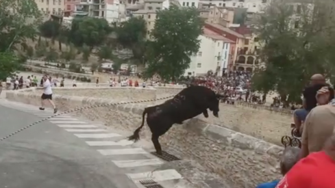 Un toro cae de una altura de 10 metros durante el 'Bou de les Penyes' de Ontinyent