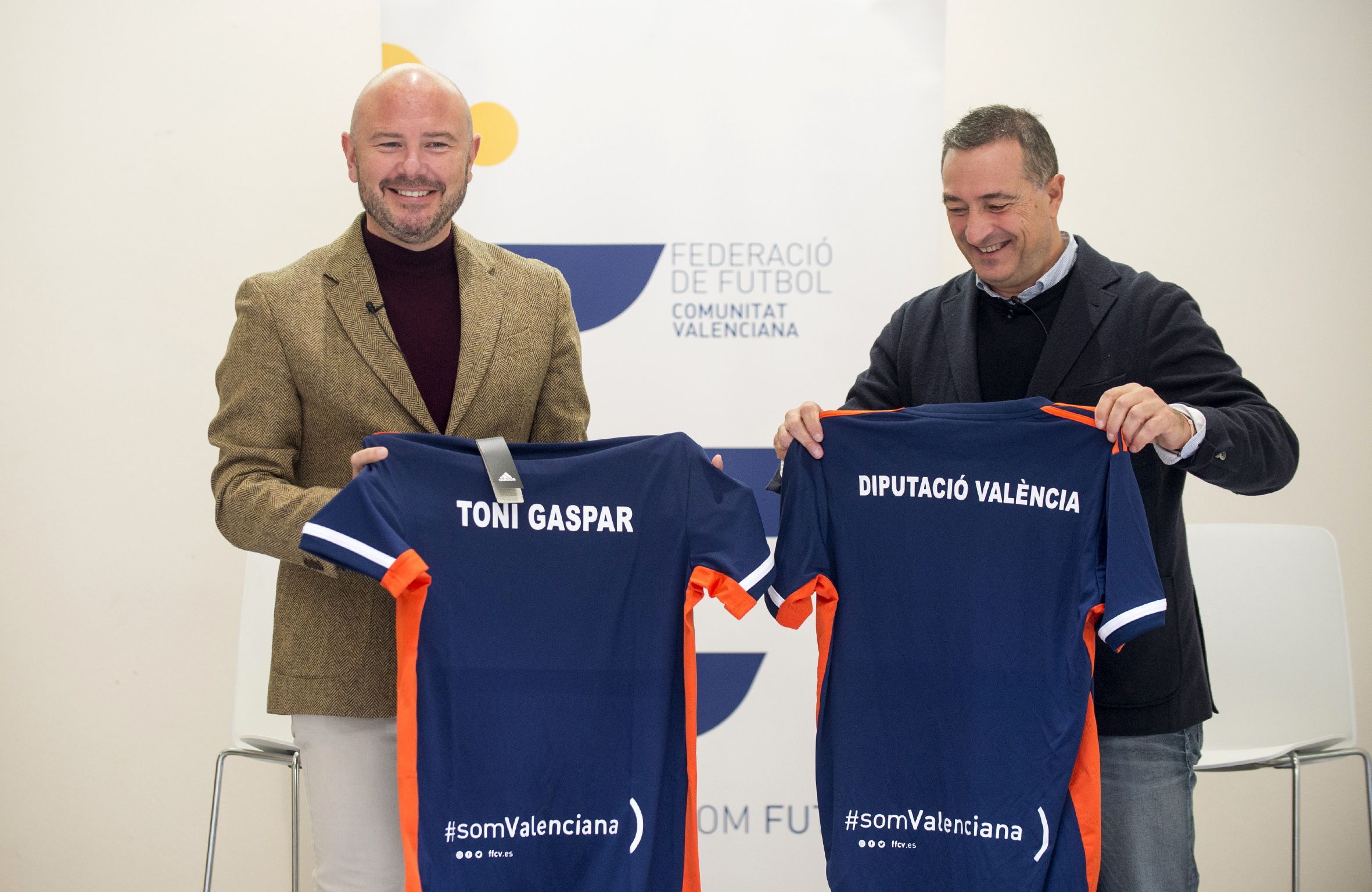 El presidente Gaspar y su homólogo en la Federació de Futbol de la Comunitat, Salva Gomar, presentan el acuerdo que un año más aporta 220.000 euros para fomentar las canteras, material deportivo, desplazamientos y bonificación de licencias para familias s
