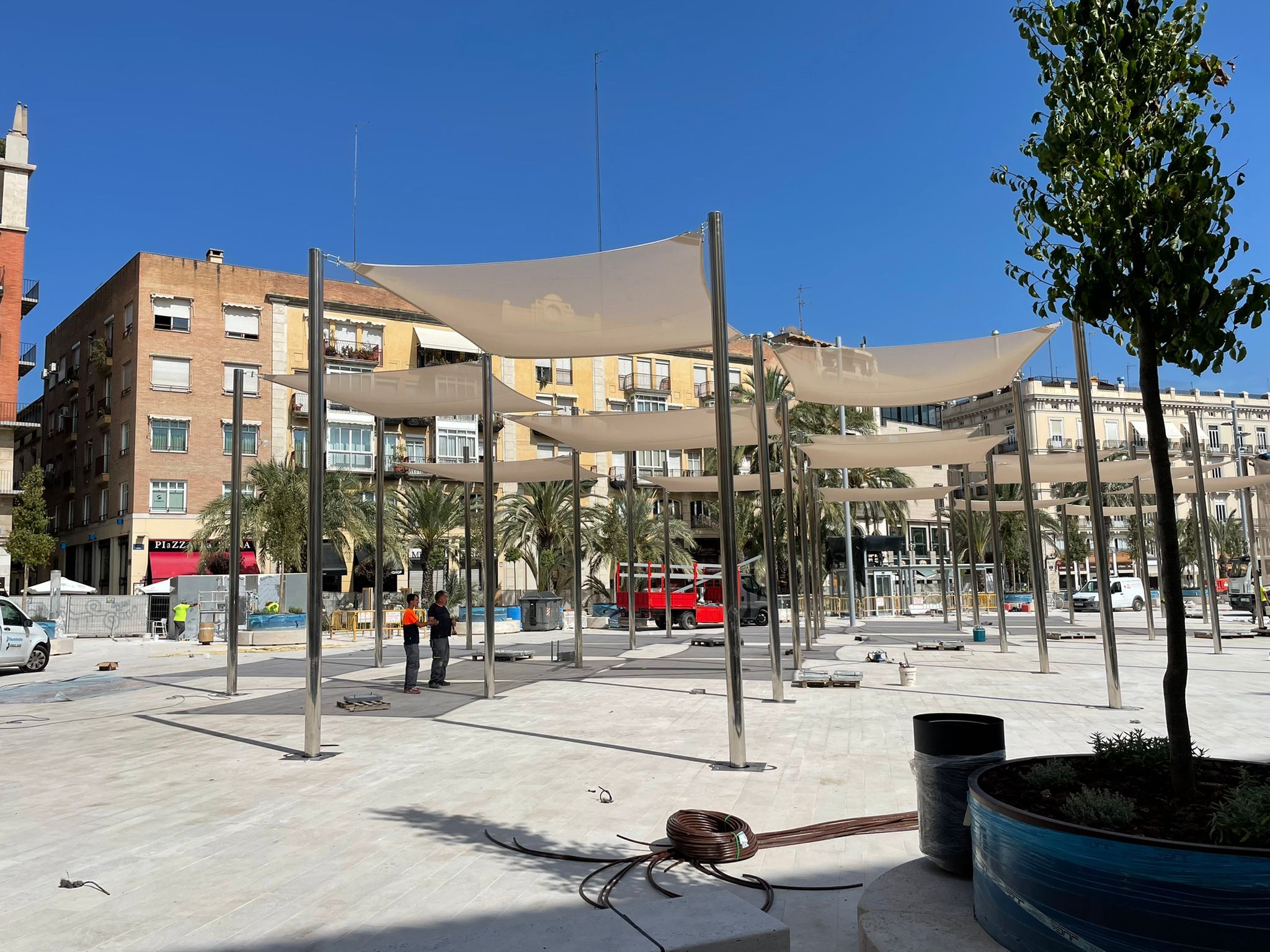La plaza de la Reina de València se abrirá al público a finales de mes Valencia Tania López Blesa 01/07/2022 Ya se están instalando los toldos que permanecerán en la plaza durante los meses de verano