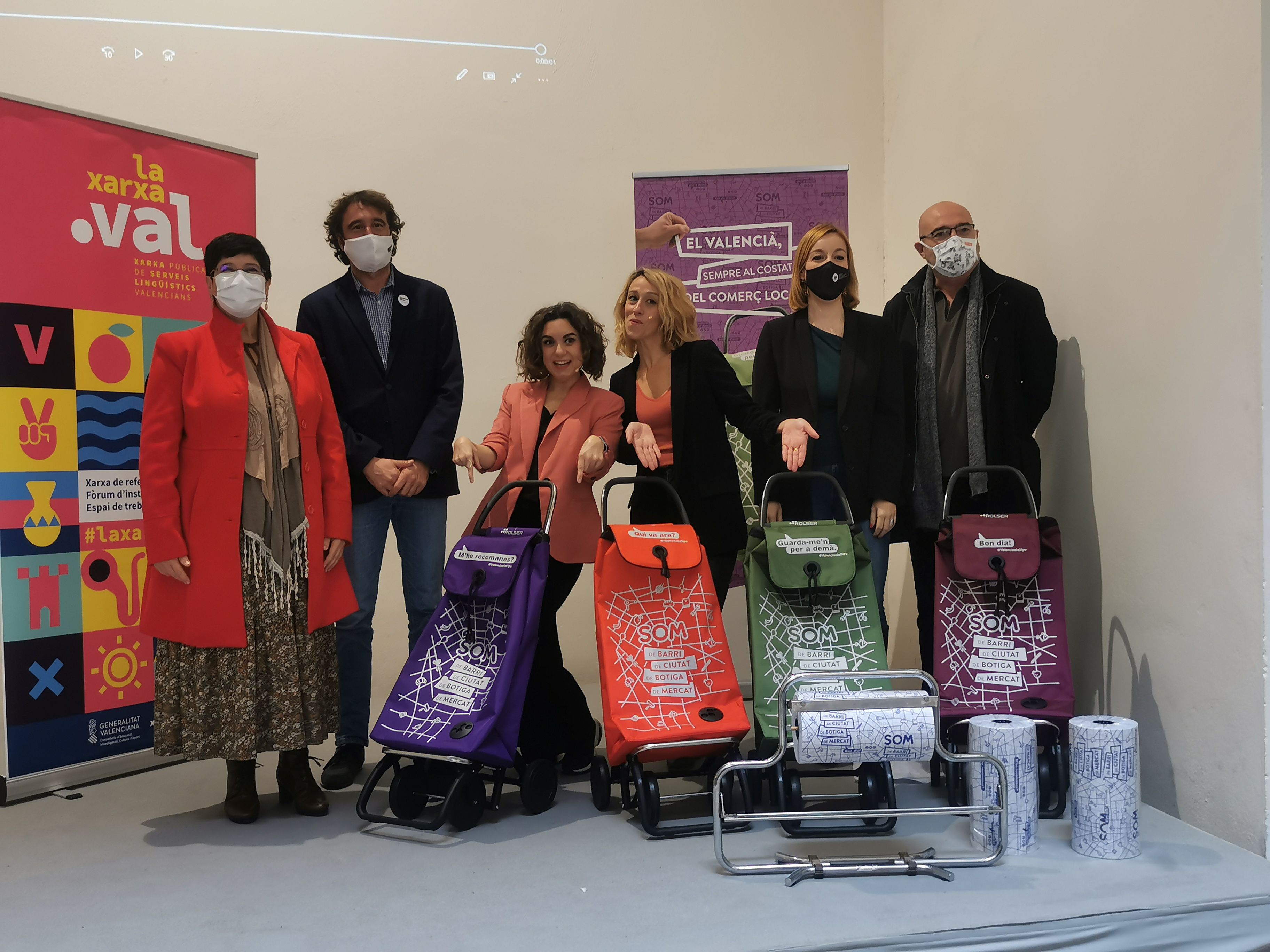 La Unidad de Normalización Lingüística de la corporación provincial presenta la campaña de fomento del valenciano en el comercio local con carros de la compra, bobinas de papel de envolver y un rap creado para la ocasión por Herbanegra