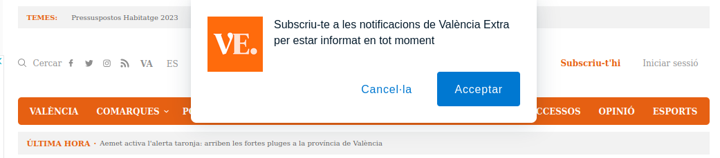 Pero estas notificaciones push no aparecen solas: es la persona usuaria la que las ha activado. Para activarlas tan solo hay que buscar en el navegador el medio de comunicación que se desea y es el propio medio el que abre una ventana en la que se pregunta si se desea recibir las últimas noticias en el navegador.