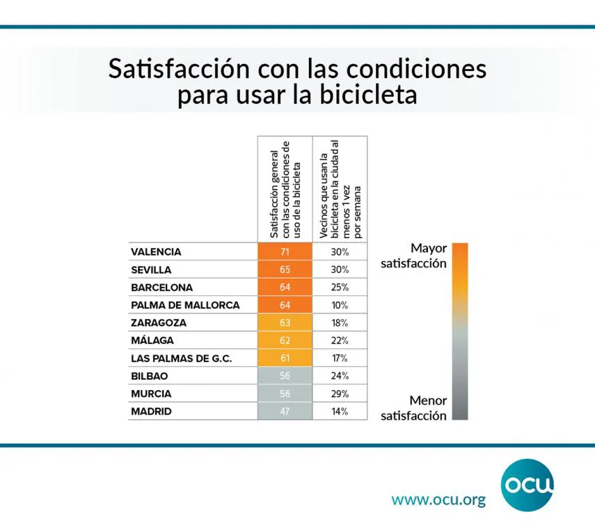 Valencia se sitúa como la ciudad española con mayor grado de satisfacción entre sus usuarios de bicileta en la ciudad. Fuente: OCU