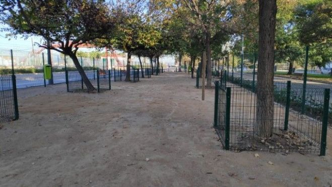 La parcela se rodea de un seto y se protege con una verja de 2 m de altura para evitar que se escape cualquier perro. Del mismo modo, también para prevenir dicha posibilidad, el acceso se proyecta con puertas dobles, desde una primera se accede a un espacio intermedio, y a continuación se puede entrar o salir de la zona canina a través de una segunda puerta. Por su parte, los alcorques de los árboles se protegen con una valla de 1,50 m de altura para que no hayan micciones de los perros en ellos. Como se trata de una parcela urbanizada, dispone de red de riego, arbolado y alumbrado sin que sea necesaria su ampliación. Asimismo la red de riego se ha ampliado con el riego por goteo para el seto perimetral.