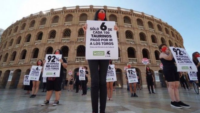 Durante la protesta, los manifestantes --vestidos de negro, con mascarillas y distancia interpersonal-- han mostrado carteles en los que se indicaba que "solo 6 de cada 100 taurinos pagó por ir a los toros" o que "el 96% de la población española no asiste a los toros" y mensajes como "Stop tauromaquia".