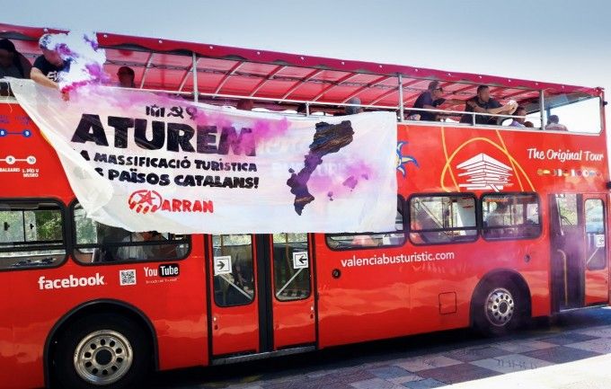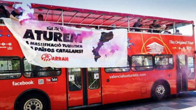 Dos miembros de la organización juvenil Arran han irrumpido este lunes en un bus turístico de València y han colgado una pancarta con el mensaje 'Paremos la masificación turística en los Països Catalans' cuando el bus estaba detenido en el paseo de l'Albereda, pocas horas de irrumpir en otro bus de estas características en Barcelona.