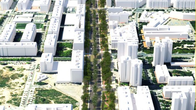 Con esta aprobación, se pretende reubicar esta zona verde en los márgenes de la avenida, de forma que, efectivamente, se conecte con las viviendas y se consigan espacios libres más amplios, conectados con las aceras y los locales situados en planta baja, pasando de un 20% a un 66% de espacios verdes y peatonales e incluyendo espacios de juego o deportivos.