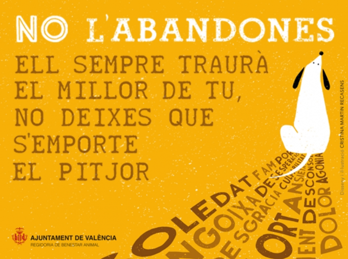 Durante la rueda de prensa, la artista Cristina Martín ha explicado las características de la campaña de sensibilización, “en la que se ha querido huir –ha indicado- de la típica imagen del animal maltratado o la crueldad, y se ha buscado el impacto gráfico del mensaje: una imagen amable que insta a actuar”. La campaña se extenderá en los próximos días por toda la ciudad: 40 mupis, columna, 5 autobuses rotulados durante 2 semanas, un video en el canal Bussi de la EMT durante una semana, y carteles en todos los locales municipales y las clínicas veterinarias de la ciudad. Para ello, la concejalía ha contado con la colaboración del Colegio Profesional de Veterinarios de Valencia. La imagen representa un perro, dibujado en estilo naïf, cuya sombra proyecta las circunstancias a que se enfrentan las mascotas cuando son abandonadas: soledad, hambre, miedo, angustia, desesperación, dolor...
