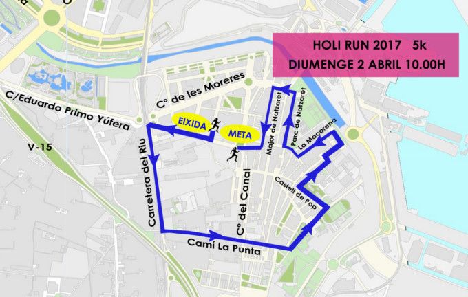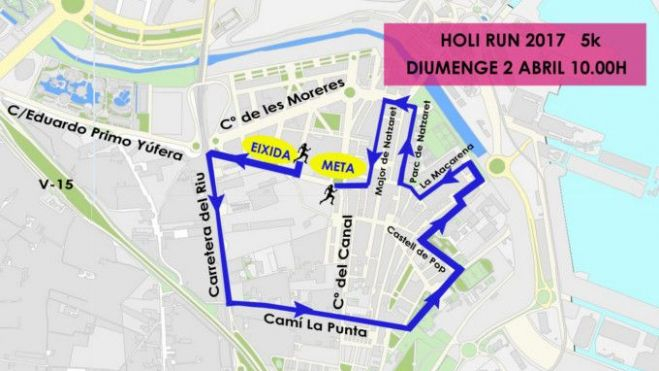 Holi Run pasa por vías como la carrera del Riu, el camino de la Punta al Mar, Castell de Pop, Jesús Nazareno, Fontilles, calle Parque de Nazaret, calle Pont de les Drassanes, calle Mayor de Nazaret y Martínez Báguena.
