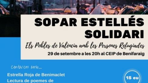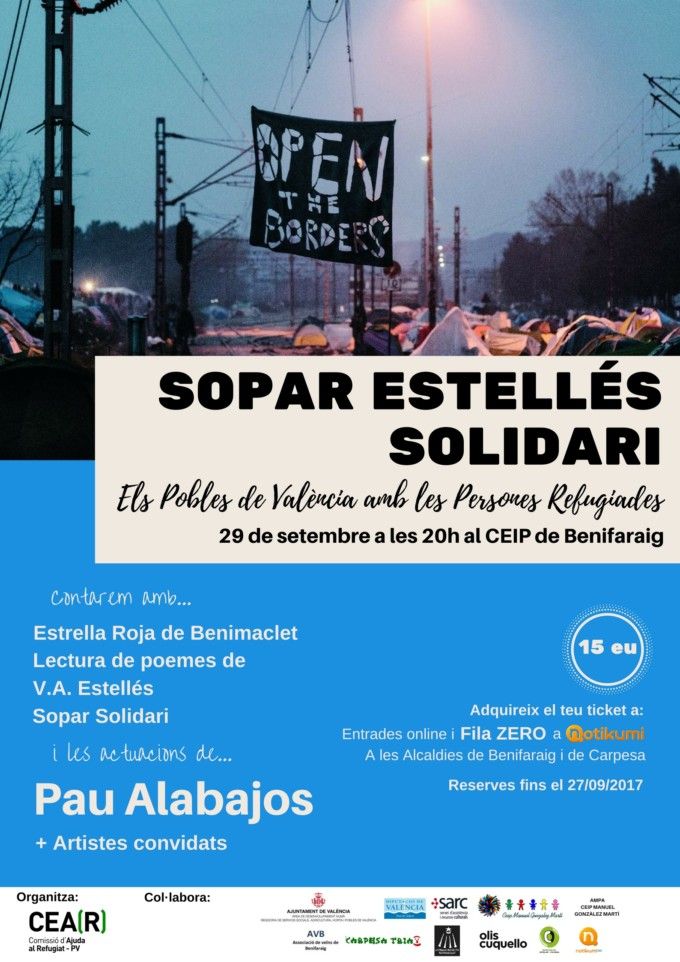 Ya están a la venta las entradas para la Cena Solidaria de Ayuda a los Refugiados que organiza la Comisión de Ayuda al Refugiado - València (CEAR-PV) en colaboración con el Ayuntamiento. Esta segunda edición llega al CEIP Manuel González Martí de Benifaraig el viernes 29 de septiembre y contará con la lectura de poemas de Vicent Andrés Estellés en las lenguas de los refugiados y la actuación del músico Pau Alabajos.