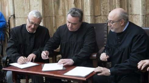 El alcalde de València, Joan Ribó, ha firmado hoy el acuerdo para la cesión del uso preferente de la Casa Vestuario al Tribunal de las Aguas para actividades de difusión, investigación y promoción del Tribunal, Patrimonio Inmaterial de la Humanidad desde 2009. El acuerdo ha sido rubricado también por el conseller de Transparencia, Responsabilidad Social, Participación y Cooperación, Manuel Alcaraz, y por el presidente del Tribunal de las Aguas de la Huerta de València, José Font.