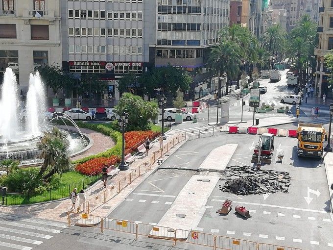 Comienzan las obras en la plaza del Ayuntamiento de València. Después del cierre definitivo al tráfico rodado, mediante una actuación blanda, ha llegado el momento de "adaptar la imagen de la plaza del Ayuntamiento a la situación actual". Para ello, "se retirará tanto el asfaltado negro como las marcas viales, que dan una imagen de corte de circulación, y se sustituirá por un nuevo pavimento, con árido de color rojo, que le aportará una tonalidad, a la nueva zona peatonal, que irá en consonancia con las actuales aceras", explicaba la vicealcaldesa Sandra Gómez durante la presentación del nuevo pavimento.