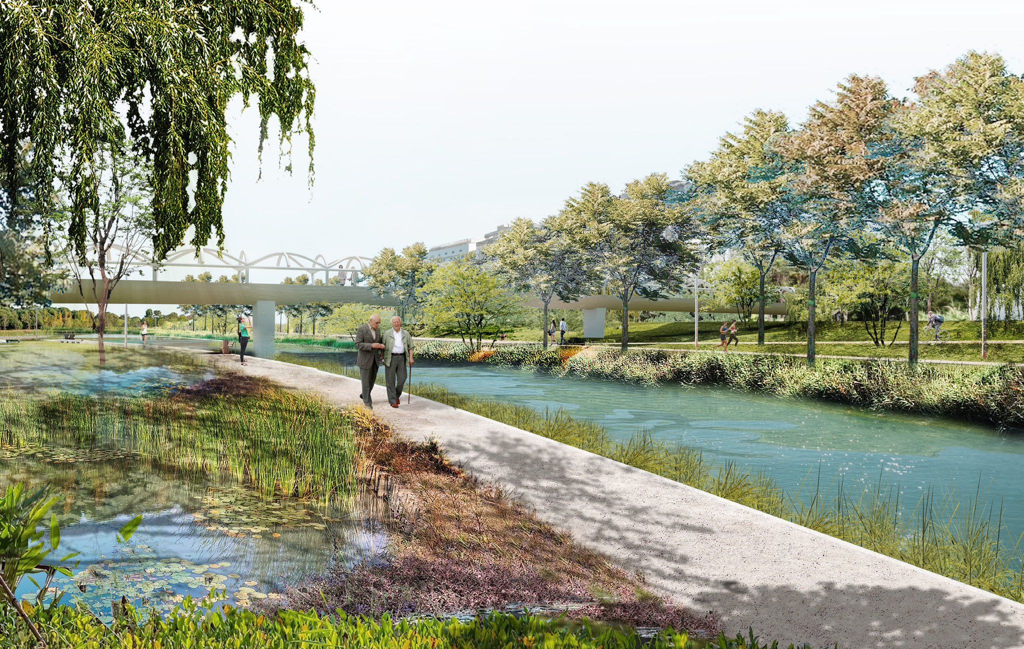 Este proyecto plantea el parque como una infraestructura verde-azul con recorridos ciclistas y peatonales, potenciando su relación con la huerta. Además, contaría con una lámina de agua irregular y pasarelas de madera simulando pequeños embarcaderos e intercalando alguna zona de playa.