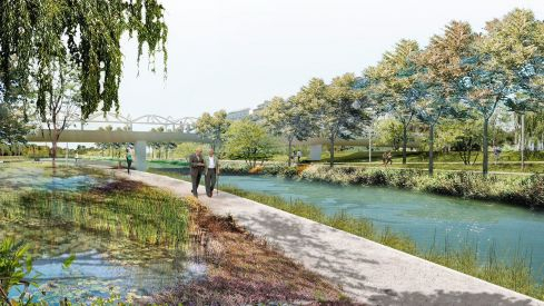 Este proyecto plantea también una especie de playa fluvial inundable, así como una barrera natural de protección para separarlo claramente de la zona portuaria, generando un entorno mucho más verde. Asimismo, incorpora paisajes de ribera a lo largo del cauce del río Turia donde se crearían praderas de esparcimiento o espacios programables.