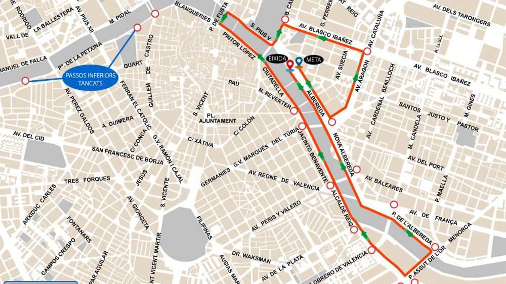La salida estará situada en el paseo de la Alameda, entre el Puente del Real y el de la Exposición, el recorrido continuará por la Alameda hasta llegar al de l’Assut de l’Or que se cruzará para continuar por la avenida de la autopista del Saler, la calle de Alcalde Reig, la avenida de Jacinto Benavente, la Ciudadela, y la calle del Pintor López hasta el Puente de Madera que se cruzará (dejando dos carriles libres para el tráfico rodado). A partir de aquí, se continuará por la calle de la Trinidad, calle de San Pío V hasta General Elio, avenida de Blasco Ibáñez (dejando el carril junto a la media libre a la circulación), la avenida de Aragón y la Alameda hasta la zona de meta, que es la misma que la de salida.