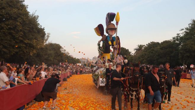 Posteriormente, empezará el desfile de carrozas donde diferentes entidades mostrarán diseños arriesgados, de gran envergadora y, sobre todo, muy coloridos. Tras la entrega de premios a las mejores carrozas, sonará el aviso que significa el inicio de la batalla en la que los espectadores podrán lanzar claveles a quienes van subidos en las carrozas.