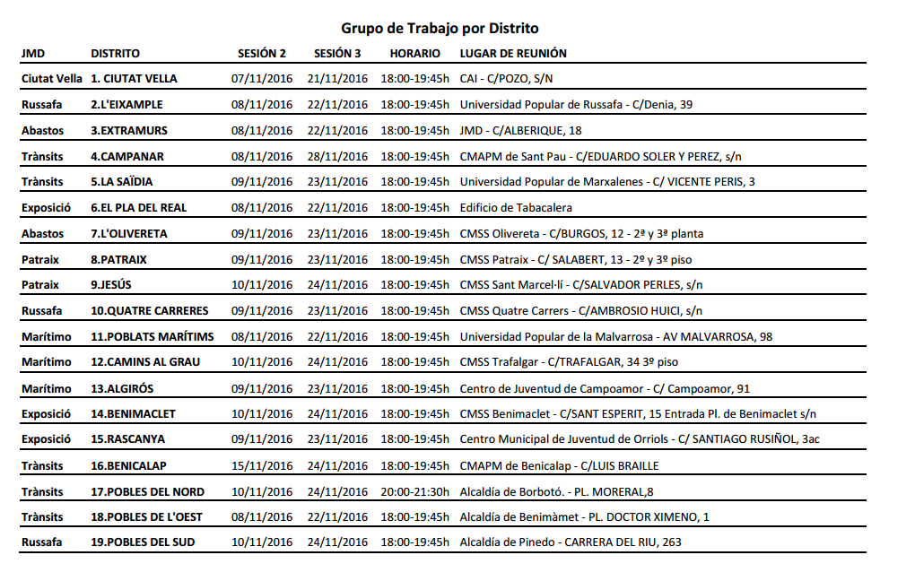 Tan solo faltará el grupo de trabajo de Benimaclet, que se ha cambiado de día y tendrá lugar el martes 15 de noviembre.