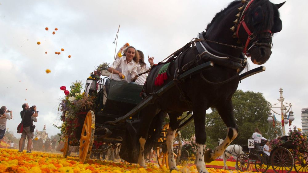 La Batalla de Flores arranca con un festejo de la Policía Municipal, seguido de la cabalgata valenciana con portadores de joyas y carros de caballos decorados con flores donde van montadas parejas con trajes tradicionales.