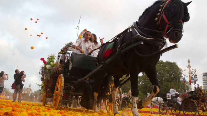 A continuación, es el momento del desfile de carrozas que, cada año, sorprende por sus diseños arriesgados y su color. Después de la entrega de premios, suena el aviso que da inicio a la gran batalla de flores que transformará el paseo de la Alameda en un manto gigante de flores. Y es que este es el momento en el que las personas que se encuentran en los palcos comienzan a lanzar miles de flores a los y las participantes que van subidas a las carrozas, mientras éstas intentan esquivarlas con una raqueta.