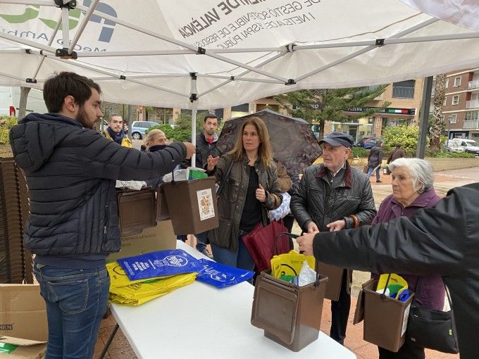 El Ayuntamiento de València ha repartido hasta ahora cerca de 13.000 kits de reciclaje entre el vecindario. Forma parte de la campaña informativa y divulgativa que se ha puesto en marcha desde el consistorio con motivo de la nueva fase de implantación de la recogida selectiva de residuos orgánicos en la ciudad. Una implantación del contenedor marrón que se está haciendo de manera progresiva y que a finales de año dará cobertura a prácticamente a 7 de cada 10 valencianos. Será durante 2020 cuando se completará todo el mapa de barrios y pueblos de València. El vicealcalde y concejal de Ecología Urbana, Sergi Campillo, ha señalado que el objetivo del gobierno municipal es "reducir el número de contenedores de color gris, donde se acumulan los residuos que no son reciclables, y al mismo tiempo incrementar las campañas de civismo".