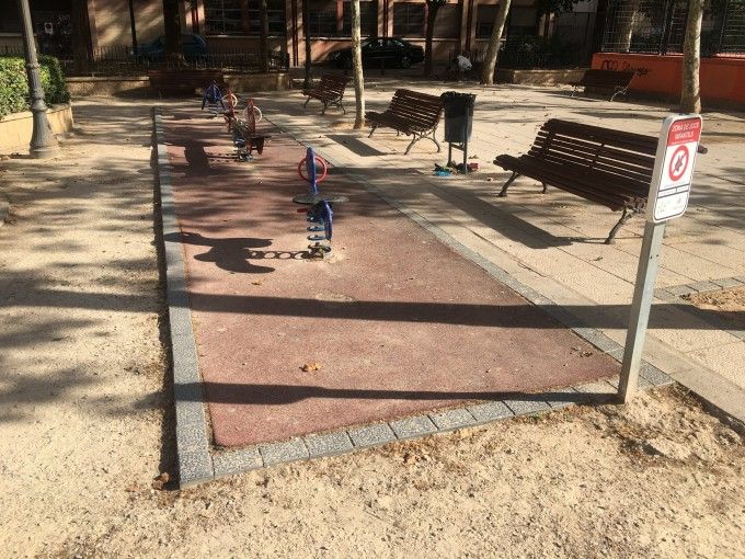 Una zona que se ubica entre una gran jardinera en su costado sur, elevada unos 30 cm sobre el nivel del pavimento anti-impacto de la zona de juegos; dos zonas de tierra morterenca a los lados este y oeste; y una zona de peatones al norte. El resto de la zona de actuación posee un pavimento de tierra morterenca y una pequeña zona lineal, aislada del resto de zona de juegos, en la que se ubican una mecedora y dos muelles. Cabe destacar que en el entorno inmediato del futuro nuevo parque se encuentra el CEIP Miquel Adlert y Noguerol, done muchos de sus alumnos y alumnas son usuarios y usuarias del actual y futuro parque inclusivo.