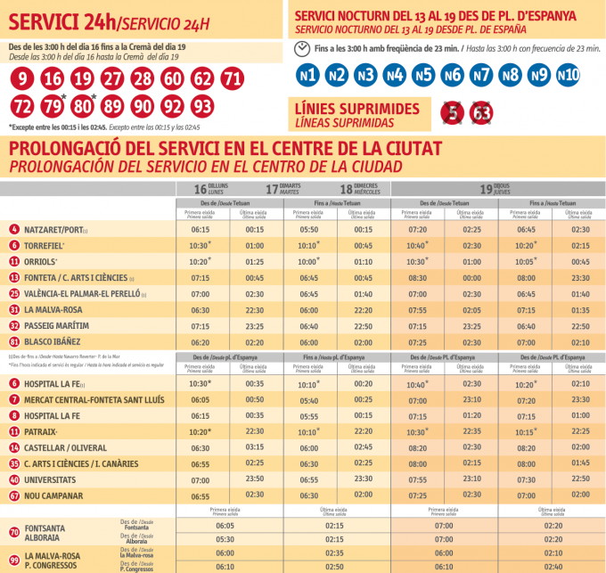 La Empresa Municipal de Transportes (EMT) pondrá en marcha un dispositivo especial de Fallas a partir del día 14 hasta el 19 de marzo, en el que se ofrecerán unas 3.8 millones de plazas para facilitar los desplazamientos durante los días grandes de las fiestas falleras. Un total de 13 líneas tendrán horario continuado las 24 horas desde el 16 al 19 de marzo, mientras que las líneas nocturnas duplicarán su servicio desde este mismo viernes.